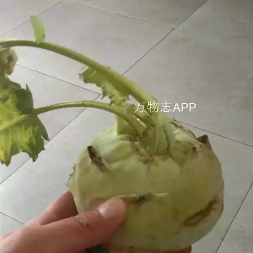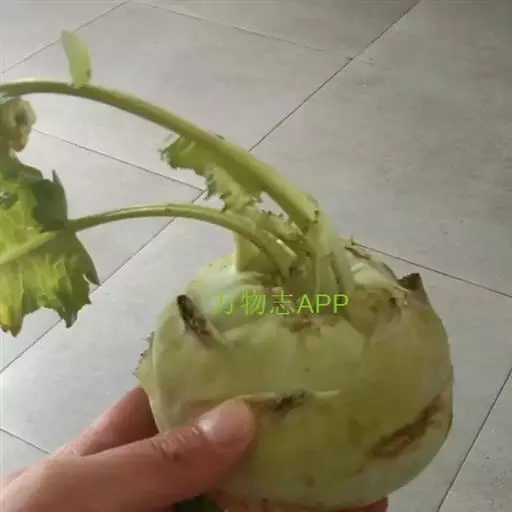 二年生粗壮直立草本,高30~60厘米。全株光滑无毛。茎短,离地面2~4厘米处,开始膨大而成为一坚硬的、长椭圆形、球形或扁球形、具叶的肉质球茎,直径5~10厘米,或过之;外皮通常淡绿色,亦有绿色或紫色者,内部的肉白色。叶长20~40厘米,其中有1/2~1/3为叶柄;叶片卵形或卵状矩圆形,光滑,被有白粉,边缘有明显的齿或缺刻,近基部通常有1~2裂片;花茎上的叶似茎叶而较小,叶柄柔弱。
