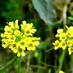 花黄白色;排列成长的总状花序;萼片4,狭而直立;花瓣4,展开如十字形;雄蕊4强;雌蕊1,子房上位,柱头头状。角果长圆柱形,喙常很短,且于基部膨大。种子小,球形,径1~2毫米,有极小的窝点。花期春季。