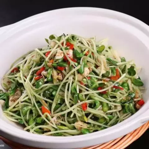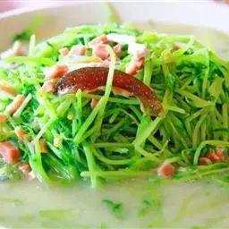 清炒豆苗三:新鲜豆苗500克,大蒜2瓣,盐、白糖适量。去掉豆苗老叶,洗净,沥干;大蒜洗净拍扁。将锅烧热,放入油和盐,爆香拍扁的大蒜,然后将豆苗入锅翻炒,放少许糖起锅,装盘。