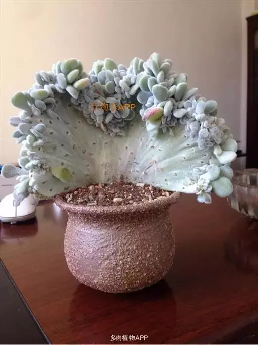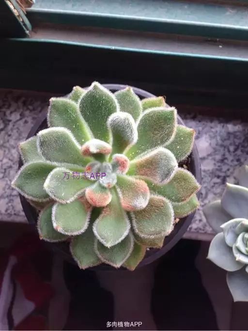 叶片与茎部多肉化,茎部短缩粗壮。匙形叶片肥厚,叶尖圆钝,尖端常枯黄。全株具有绒毛,叶片上白色绒毛长度可达0.2mm。冬春季开花,总状花序自叶腋伸出,花朵钟形橘黄色。 景天科拟石莲花属,植物的特别之处,是顶端点缀着红褐色,被厚厚绒毛包裹的绿色叶片。