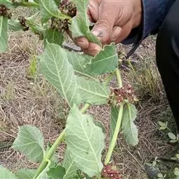 选用2年生以上的成熟、饱满、发芽率85%以上的种子。春季2~4月播种,种子用草木灰或细沙拌匀,均匀撒入2cm左右深的播种沟内,上面撒一层草木灰或腐殖土,再盖草保湿,行距12~15cm。15天左右出苗,出苗后及时拿走盖草。通过间苗、定苗、松土、追肥、除草等一系列管理,于冬季倒苗后至第2年春季幼苗萌发前,小心地采挖种根,按照行距20~25cm、株距10~12cm移栽,移栽后立即浇水定根。用这种方法繁殖,每亩播种量控制在1.5~2.5kg,育出的苗(种根)可种植10亩左右的大田。
