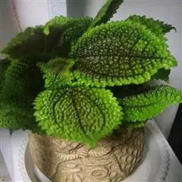 植株细小,具粗壮肥大的肉质根状茎,根状茎匍匐生长,有极短的节,叶和花均从根状茎上长出,在靠近土面处长成一蔟。其叶片卵圆形,具长柄,叶柄绿色,有红褐色斑点,叶长约4 厘米,叶面暗红褐色,有不规则的绿色斑块,叶缘具白毛。花粉白色,不甚显著。其叶片斑斓,株形紧凑,是优良的观叶植物,宜用小盆栽种,点缀窗台、几案、书桌等处。