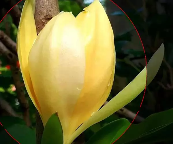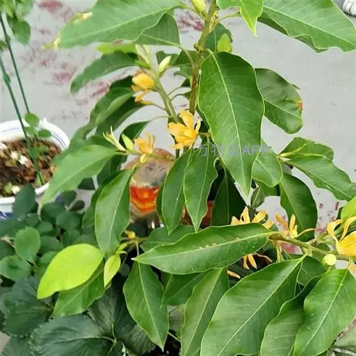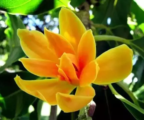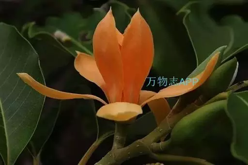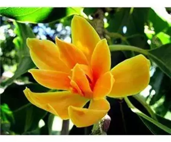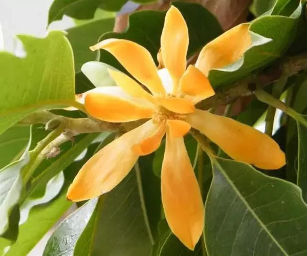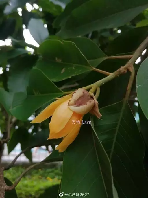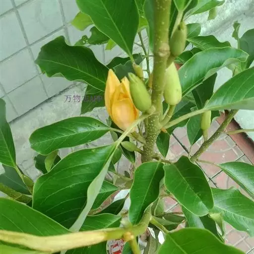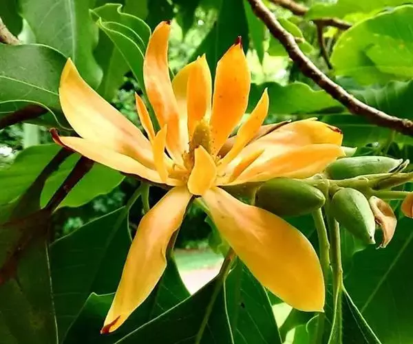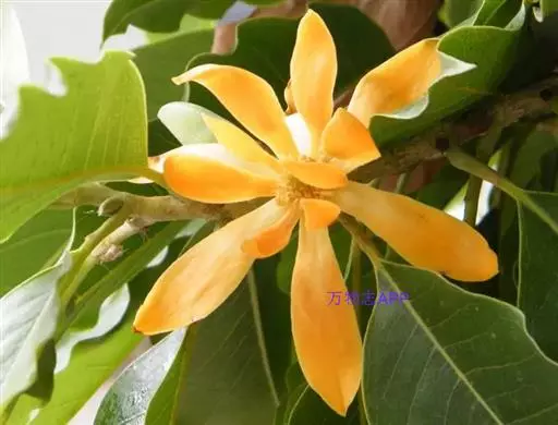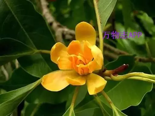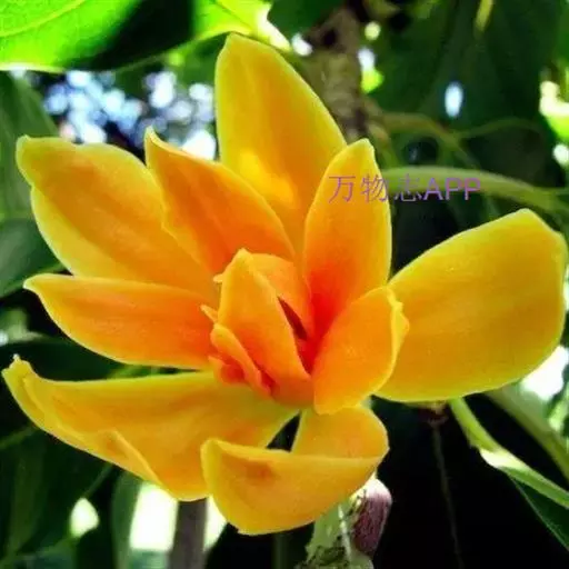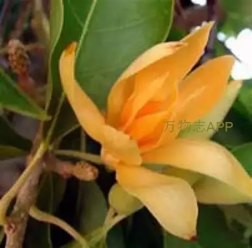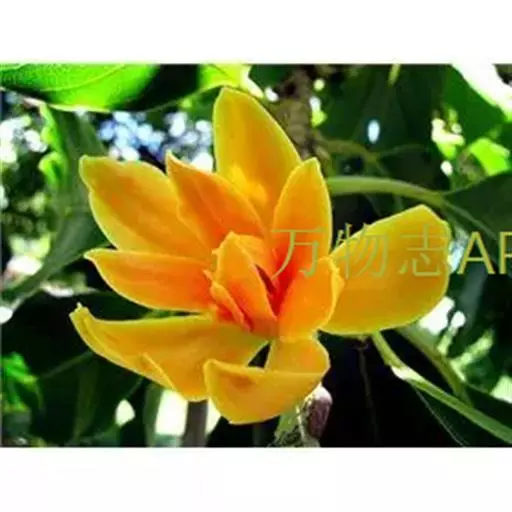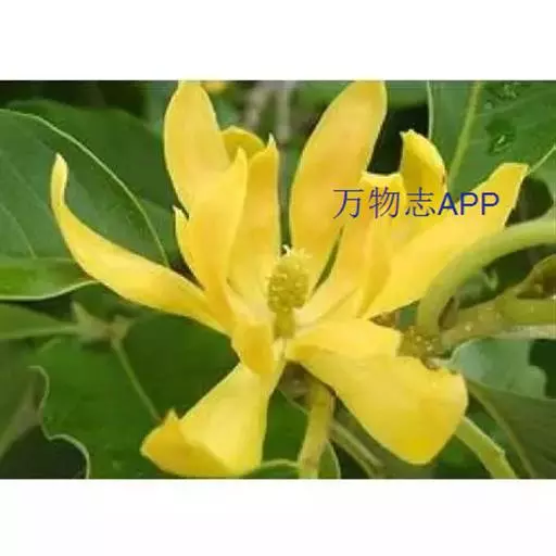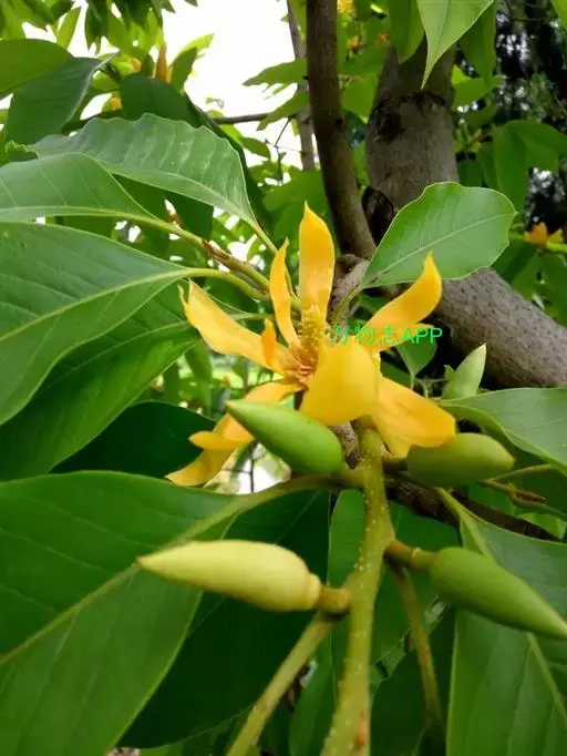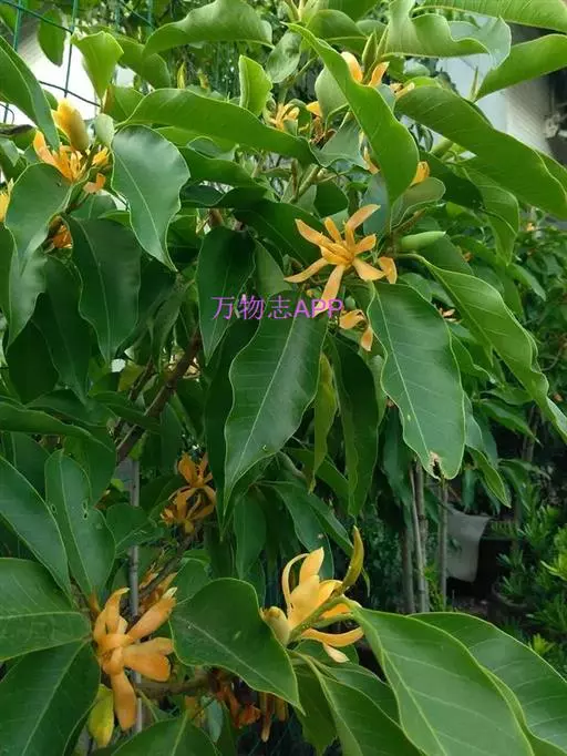 黄兰(Michelia champaca Linn.):常绿乔木,高达10余米;枝斜上展,呈狭伞形树冠;芽、嫩枝、嫩叶和叶柄均被淡黄色的平伏柔毛。叶薄革质,披针状卵形或披针状长椭圆形,下面稍被微柔毛。花黄色,极香,花被片15-20片,倒披针形,长3-4厘米,宽4-5毫米;蓇葖倒卵状长圆形,长1-1.5厘米,有疣状凸起;种子2-4枚,有皱纹。花期6-7月,果期9-10月。