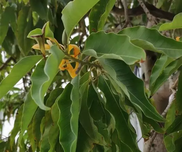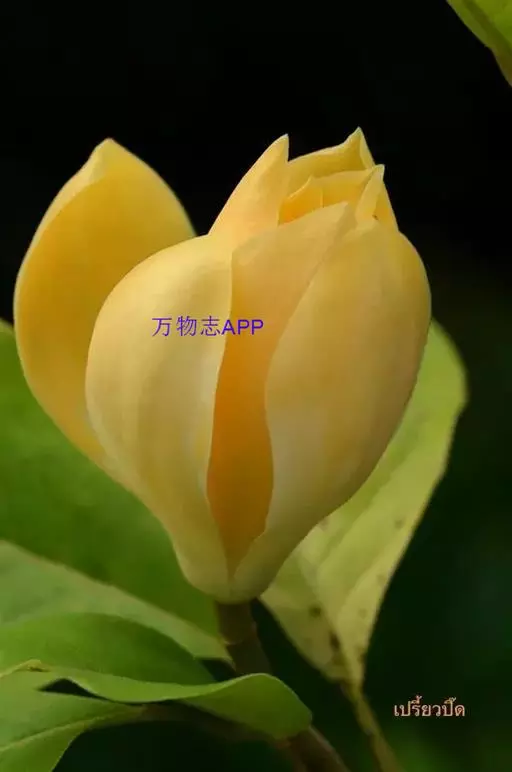 黄兰是常绿乔木植物,高达10余米;枝斜上展,呈狭伞形树冠;芽、嫩枝、嫩叶和叶柄均被淡黄色的平伏柔毛。叶薄革质,披针状卵形或披针状长椭圆形,长10-20(25)厘米,宽4.5-9厘米,先端长渐尖或近尾状,基部阔楔形或楔形,下面稍被微柔毛;叶柄长2-4厘米,托叶痕长达叶柄中部以上。
