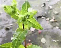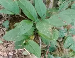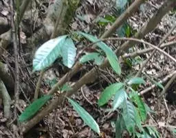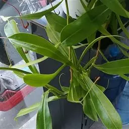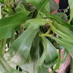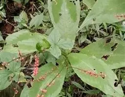攀援茎的叶片主要为长圆状椭圆形,但少数也可能为披针形。其较短茎的叶片大,但相对较短,可长达5至15厘米,宽至1.8至4厘米。叶片末端可能为急尖至钝尖,而基部骤缩,包住茎;某些植株的叶片可能下延至1.5厘米。中脉的两侧各有2条(极少数可达4条)纵脉。其仅存在于叶片外侧三分之一至二分之一(极少数可达三分之二)。羽状脉不明显;其为特征性的,分叉。