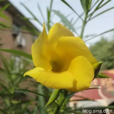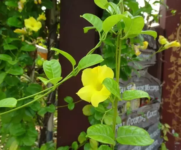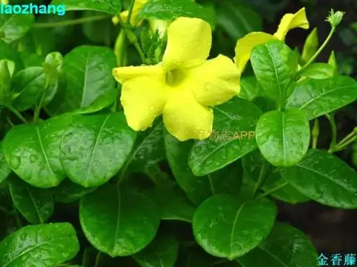 常绿藤本,茎有白色乳汁。叶对生,椭圆形,全缘,革质,富有光泽。花冠黄色,漏斗形。