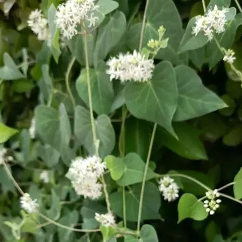 金香藤常绿缠绕性蔓性藤本,茎缠绕性,具白色体液;叶对生,椭圆形,先端圆或微突,全缘,革质,明亮富光泽。