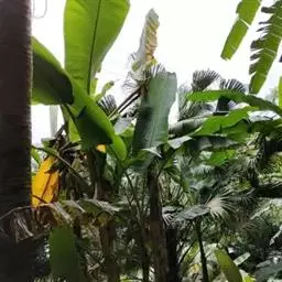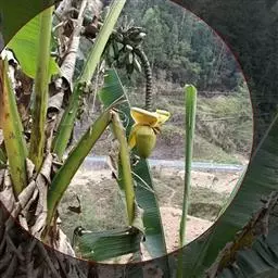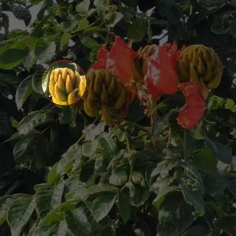 紫苞芭蕉形如一枝亭亭玉立、含苞待放的荷花,但却开在高高的芭蕉树上,这就是紫苞芭蕉。