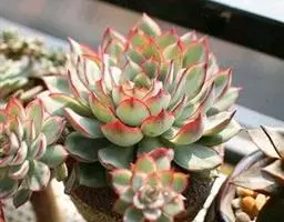 叶子表面宽厚,富肉质感且带有磨纱质感,看像石头质地;开红色小花,生于植株顶部,倒伞形密生,形状像花…
