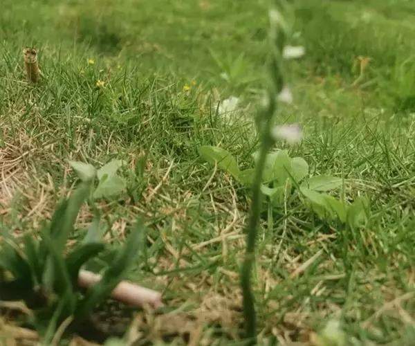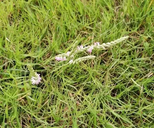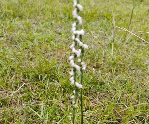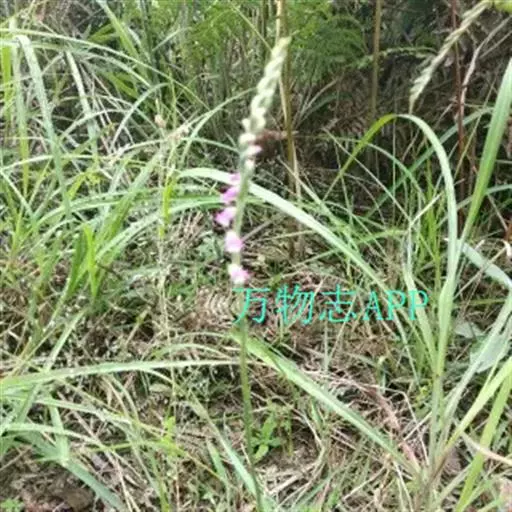 绶草(学名:Spiranthes sinensis (Pers.) Ames):植株高13-30厘米。根数条,指状,肉质,簇生于茎基部。茎较短,近基部生2-5枚叶。叶片宽线形或宽线状披针形,极罕为狭长圆形,直立伸展。花茎直立,长10-25厘米,上部被腺状柔毛至无毛;总状花序具多数密生的花,长4-10厘米,呈螺旋状扭转;花小,紫红色、粉红色或白色,在花序轴上呈螺旋状排生;萼片的下部靠合,中萼片狭长圆形,舟状,长4毫米,宽1.5毫米,先端稍尖,与花瓣靠合呈兜状。花期7-8月。