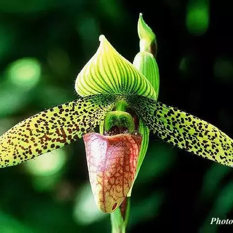 花瓣斜菱状长圆形,先端钝,与中萼片等长但较薄;唇瓣宽长圆形,凹陷,长4毫米,宽2.5毫米,先端极钝,前半部上面具长硬毛且边缘具强烈皱波状啮齿,唇瓣基部凹陷呈浅囊状,囊内具2枚胼胝体。花期7-8月。