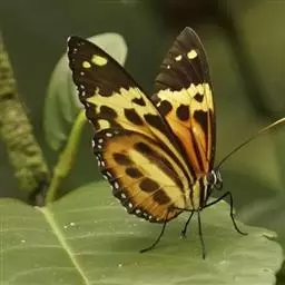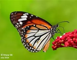 虎斑蝶,Danaus genutia (Cramer),是斑蝶属的一种,常见于湿地公园内。雄性虎斑蝶经常伏于吊裙草 (Crotalaria retusa) 上吸食汁液,以制造吸引异性的香气。虎斑蝶翅膀腹面鲜橙色,翅脉和翅边缘黑色,边缘上有两行小白点,前翅端黑褐色,翅端有大的黑色区,区内有一条由5个相邻的白色棒状白斑组成的白色斜带;是优良的工艺、生态观赏和喜庆放飞三用蝶种,南亚热带和热带地区常见,但较少被养殖。对经济和园林植物无危害记录。