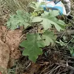 叶大,卵形至长圆状卵形,长8-18厘米或更长,宽5-11厘米或更宽,先端钝,基部不相等,边缘浅波状或深波状圆裂,上面被3-7-(8)分枝短而平贴的星状绒毛,下面密被7-8分枝较长而平贴的星状绒毛,侧脉每边4-5条,在上面疏被星状绒毛,在下面则较密,中脉的毛被与侧脉的相同(野生种的中脉及侧脉在两面均具小皮刺),叶柄长约2-4.5厘米(野生的具皮刺)。