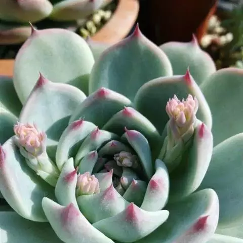 大和锦是景天科拟石莲花属的多肉植物。肉质叶排成紧密的莲座状,广卵形至散三角卵形,背面突起呈龙骨状,…