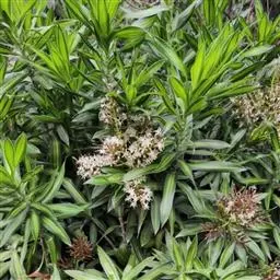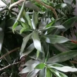 密叶百合竹 多年生长绿灌木或小乔木。叶线形或披针形,全缘,浓绿有光泽,松散成簇;花序单生或分枝,常反折,花白色,为雌雄异株。花序单生或分枝,小花白色。其斑叶品种金边百合竹也见于栽培,叶缘有金黄色纵条纹;金心百合竹,叶缘绿色,中央呈金黄色。