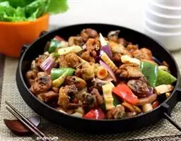 1.鸡剁去头爪,用清水洗净。鸡肫剁成末。元蘑挤净水,切成丝。葱一切两半,再切成 3厘米长的丝。银杏去壳,加精盐炒成绿色。