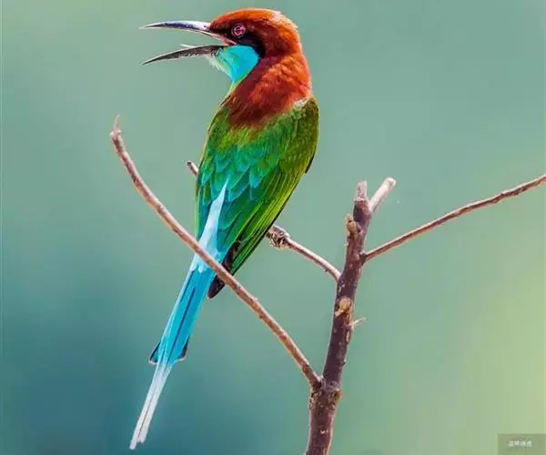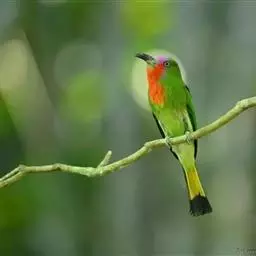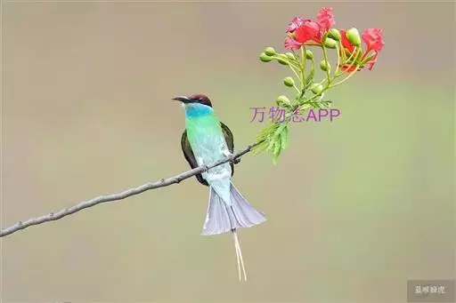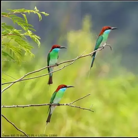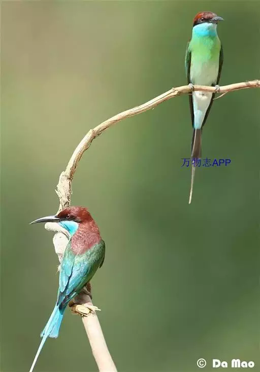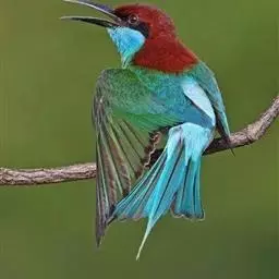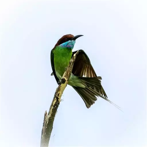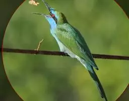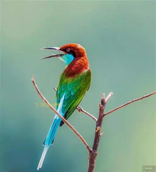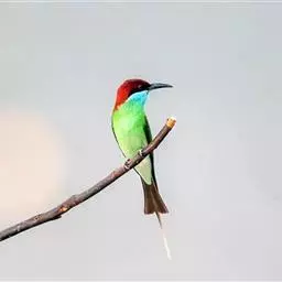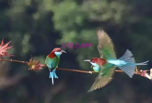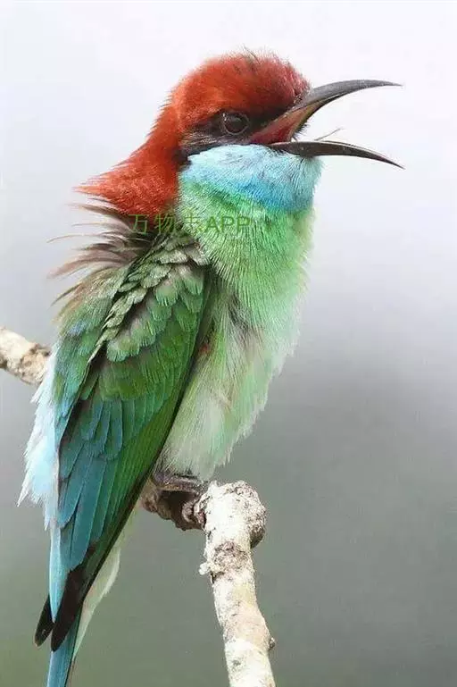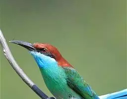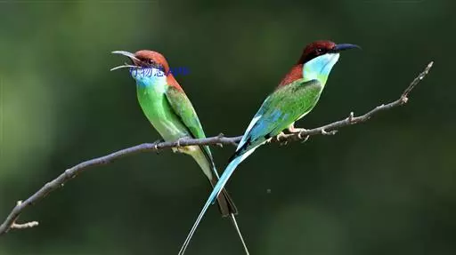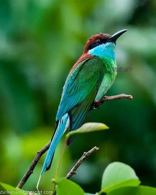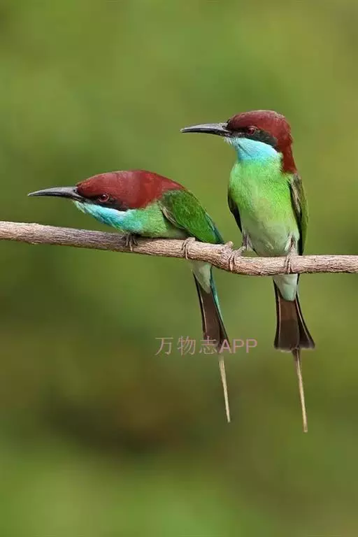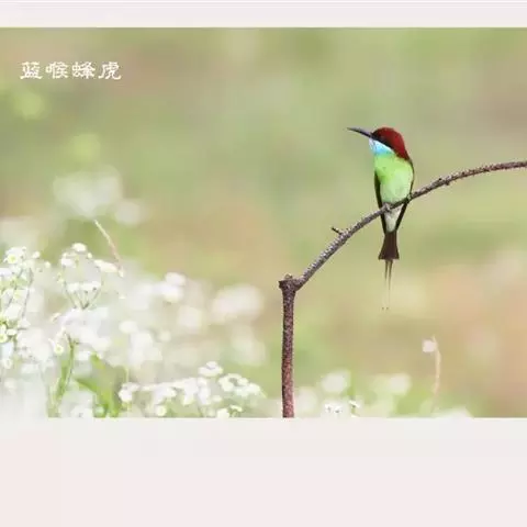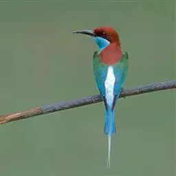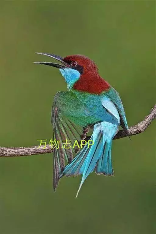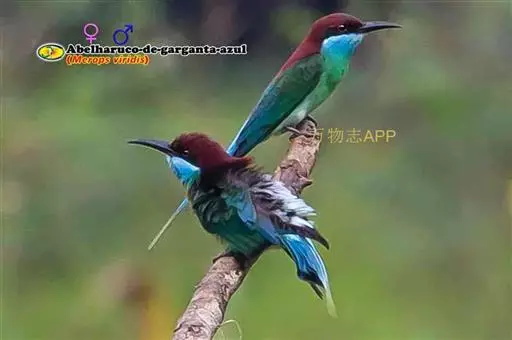 蓝喉蜂虎(学名:Merops viridis)中型鸟类,体长26~28厘米。头顶至上背栗红色或巧克力色,过眼线黑色,腰和尾蓝色,翼蓝绿色,腰及长尾浅蓝,中央尾羽延长成针状,明显突出于外。颏喉蓝色,其余下体和两翅绿色。嘴细长而尖,黑色,微向下曲。
