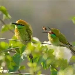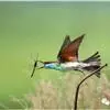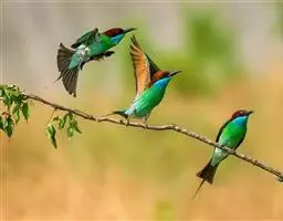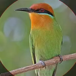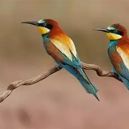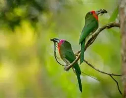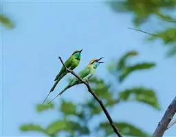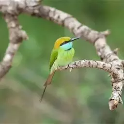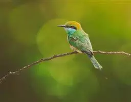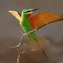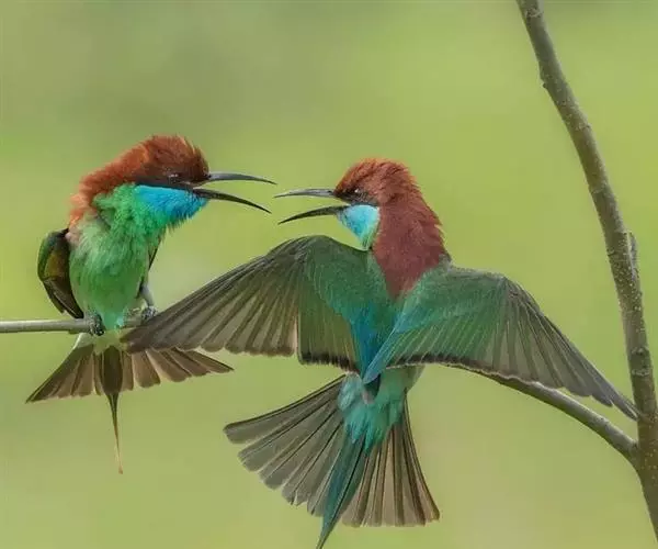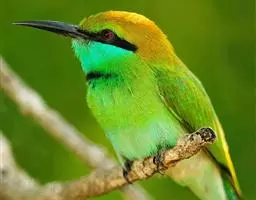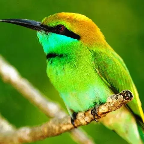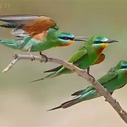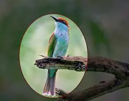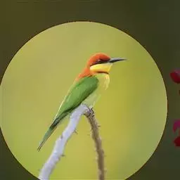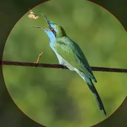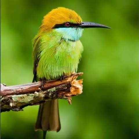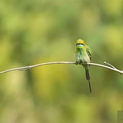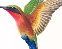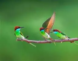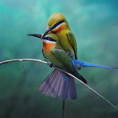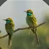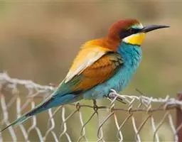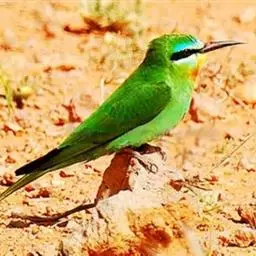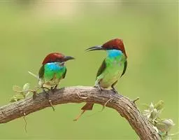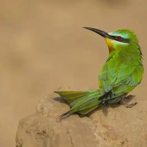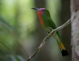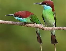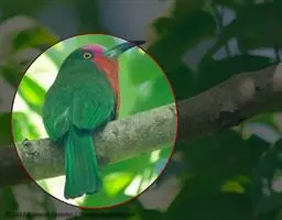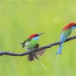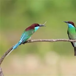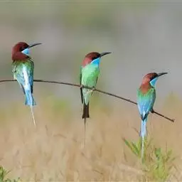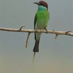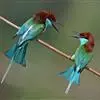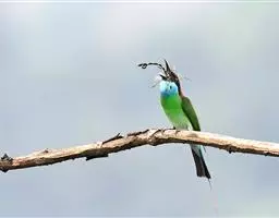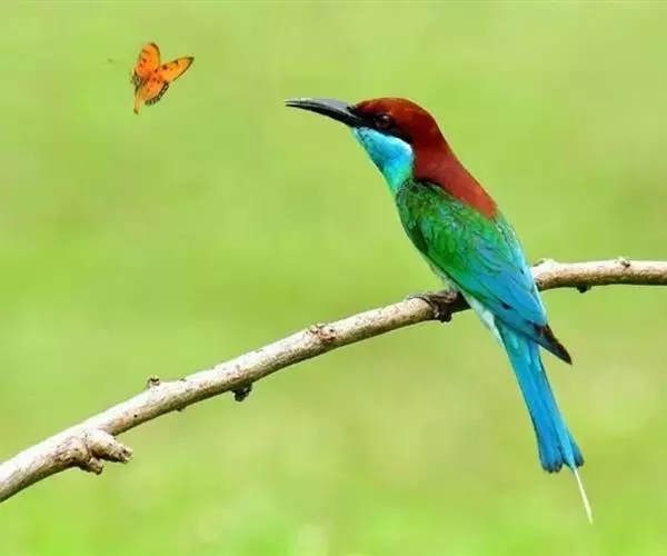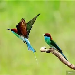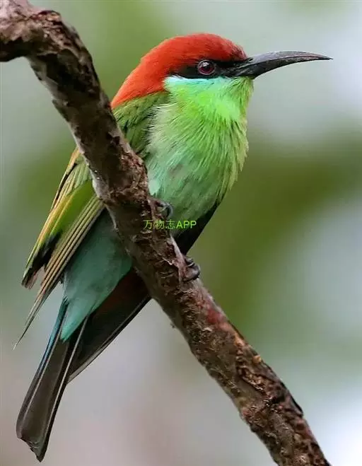 蓝喉蜂虎(学名:Merops viridis)中型鸟类,体长26~28厘米。头顶至上背栗红色或巧克力色,过眼线黑色,腰和尾蓝色,翼蓝绿色,腰及长尾浅蓝,中央尾羽延长成针状,明显突出于外。颏喉蓝色,其余下体和两翅绿色。嘴细长而尖,黑色,微向下曲。
