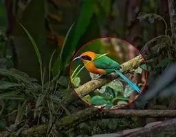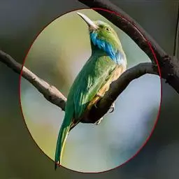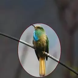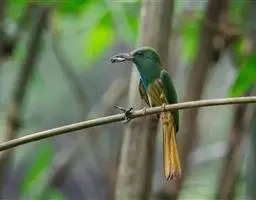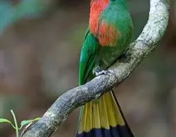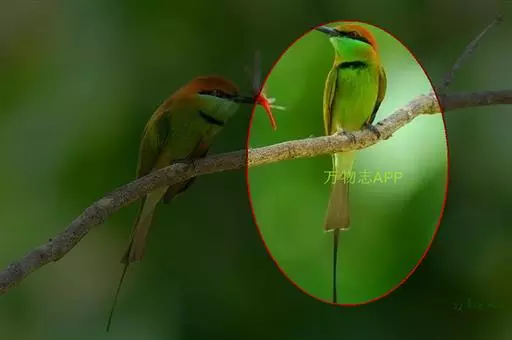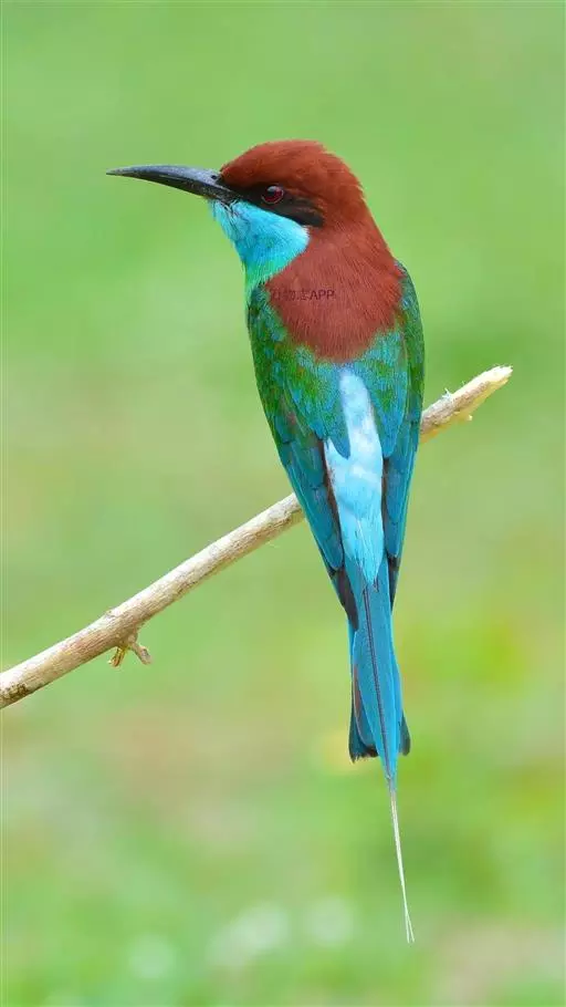 前额、头顶、枕、后颈和上背深栗色,下背蓝绿色,腰天蓝色,尾蓝色,中央尾羽延长,突出约65毫米;肩和翅绿色,内侧飞羽蓝色,贯眼纹黑色,到眼后变宽。颏、喉和颈侧蓝色,胸和上腹绿色,腹淡绿色,尾下覆羽淡蓝色。