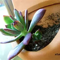 松果红爪 植株直立,株高20厘米以内,成株呈塔状或松果。叶排列呈莲座状,叶片长匙形,肉质,被白霜,具明显的短叶尖,呈暗紫红色,叶片不易晒红。紫红色的花茎抽出自叶腋,总状花序,小花钟形,花瓣5,花瓣背部橙红色,花瓣内部相对背部偏黄。可采用叶插和播种繁殖栽培,性喜光照充足、温暖、干燥的生长环境。