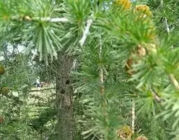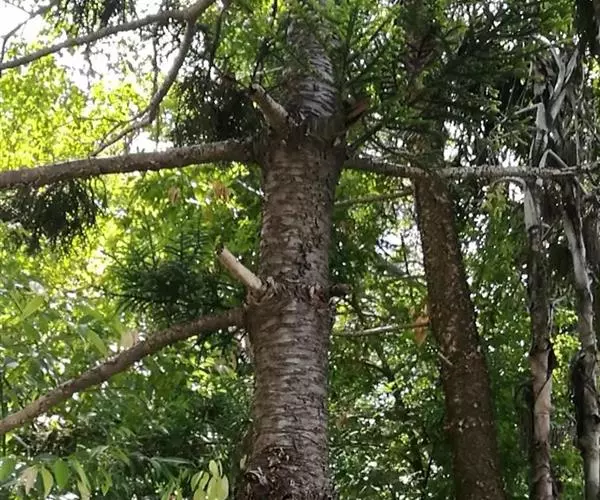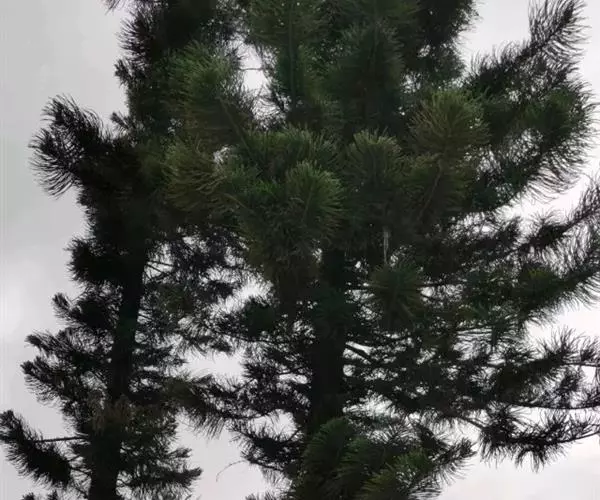 南洋杉,乔木,在原产地高达60~70米,胸径达1米以上,树皮灰褐色或暗灰色 南洋杉 ,粗,横裂;大枝平展或斜伸,幼树冠尖塔形,老则成平顶状,侧身小枝密生,下垂,近羽状排列。叶二型:幼树和侧枝的叶排列疏松,开展,锥状、针状、镰状或三角状,长7~17毫米,基部宽约2.5毫米,微弯,微具四棱或上(腹)面的棱脊不明显,上面有多数气孔线,下面气孔线不整齐或近于无气孔线,上部渐窄,先端具渐尖或微急尖的尖头;大枝及花果枝上之叶排列紧密而叠盖,斜上伸展,微向上弯,卵形,三角状卵形或三角状,无明显的脊背或下面有纵脊,长6~10毫米。球果卵圆形或椭圆形,长6~10厘米,宽约4厘米,基部宽,上部渐窄或微圆,先端尖或钝,中脉明显或不明显,上面灰绿色,有白粉,有多数气孔线,下面绿色,仅中下部有不整齐的疏生气孔线。雄球花单生枝顶,圆柱形。球果卵形或椭圆形,长6~10厘米,径4.5~7.5厘米;苞鳞楔状倒卵形,两侧具薄翅,先端宽厚,具锐脊,中央有急尖的长尾状尖头,尖头显著的向后反曲;舍庄重林的先端薄,不肥厚;种子椭圆形,两侧具结合而生的膜质翅。