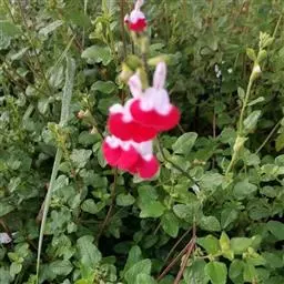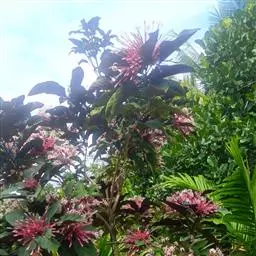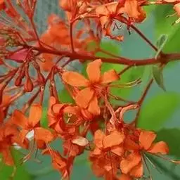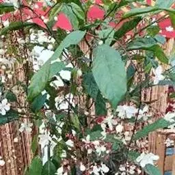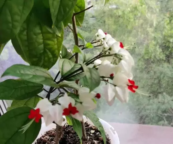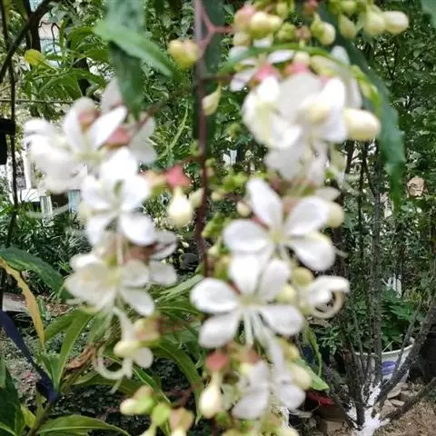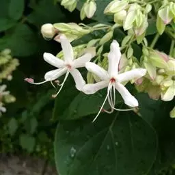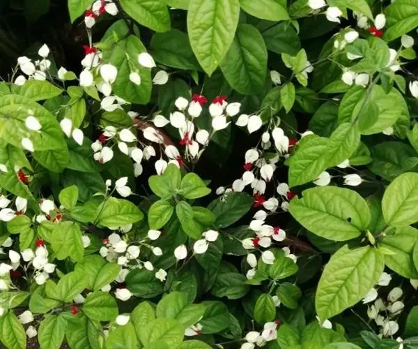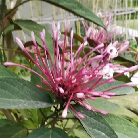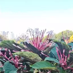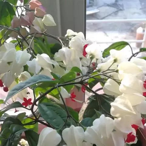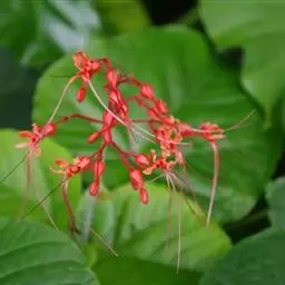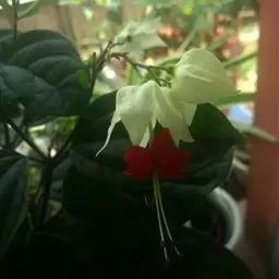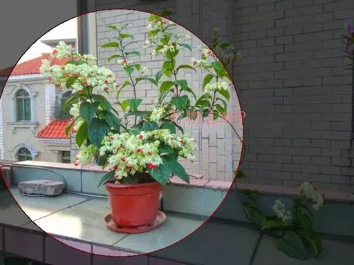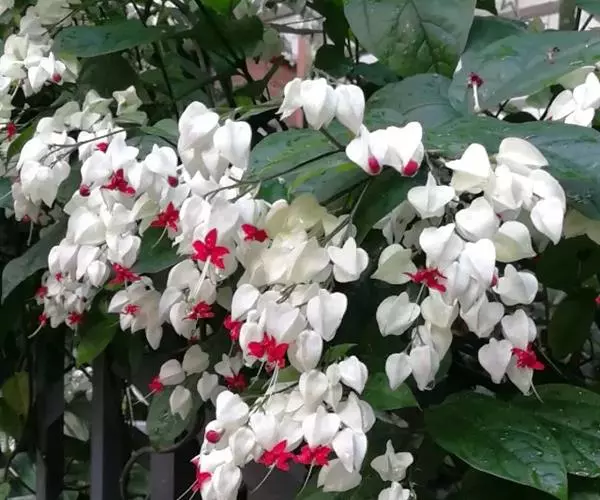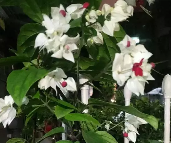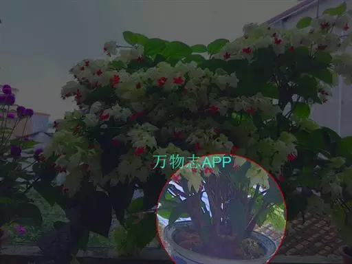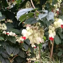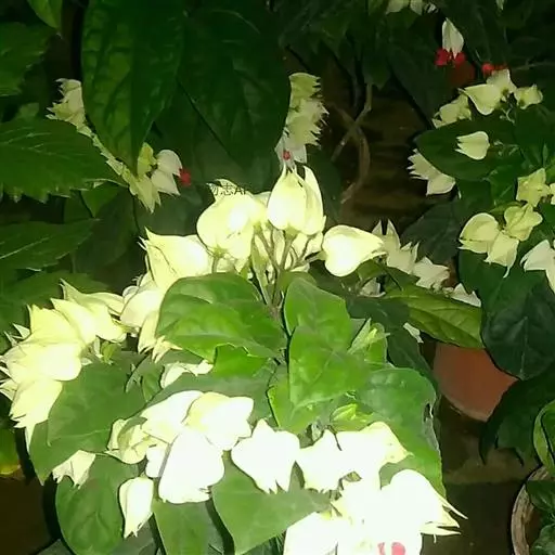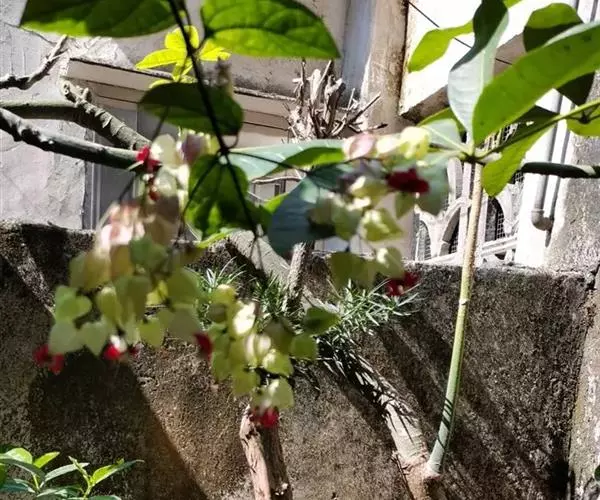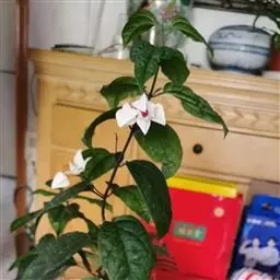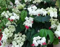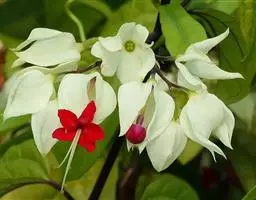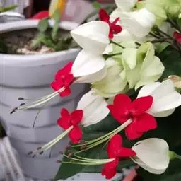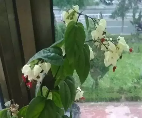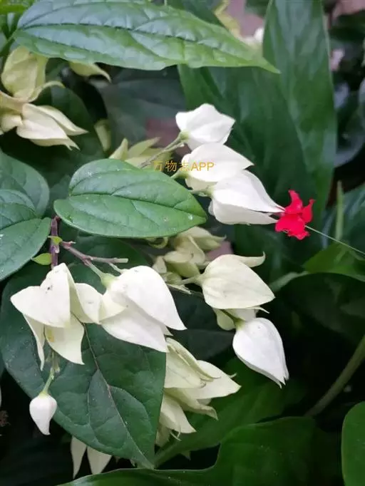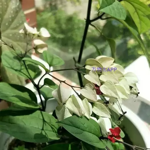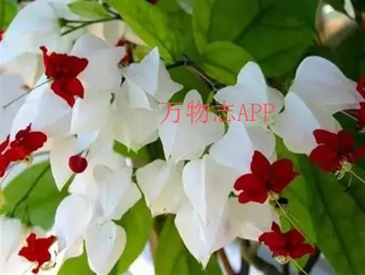 龙吐珠(学名:Clerodendrum thomsonae Balf.):马鞭草科灌木,幼枝四棱形,被黄褐色短绒毛,老时无毛。叶片纸质,狭卵形或卵状长圆形,顶端渐尖,基部近圆形,全缘;聚伞花序腋生或假顶生,二歧分枝;苞片狭披针形;花萼白色,基部合生,中部膨大,裂片三角状卵形,顶端渐尖;花冠深红色,外被细腺毛,裂片椭圆形;雄蕊4,与花柱同伸出花冠外;柱头2浅裂。核果近球形,外果皮光亮,棕黑色;宿存萼不增大,红紫色。花期3-5月。