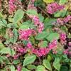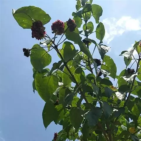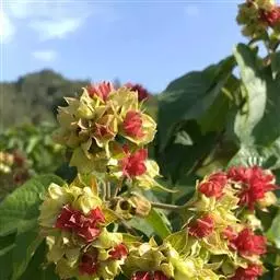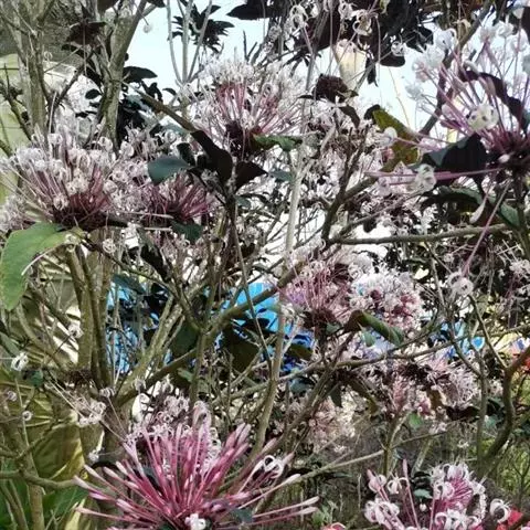 聚伞花序腋生或假顶生,二歧分枝,长7-15厘米,宽10-17厘米;苞片狭披针形,长0.5-1厘米;花萼白色,基部合生,中部膨大,有5棱脊,顶端5深裂,外被细毛,裂片三角状卵形,长1.5-2厘米,宽1-1.2厘米,顶端渐尖;花冠深红色,外被细腺毛,裂片椭圆形,长约9毫米,花冠管与花萼近等长;雄蕊4,与花柱同伸出花冠外;柱头2浅裂。