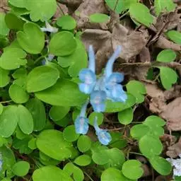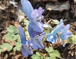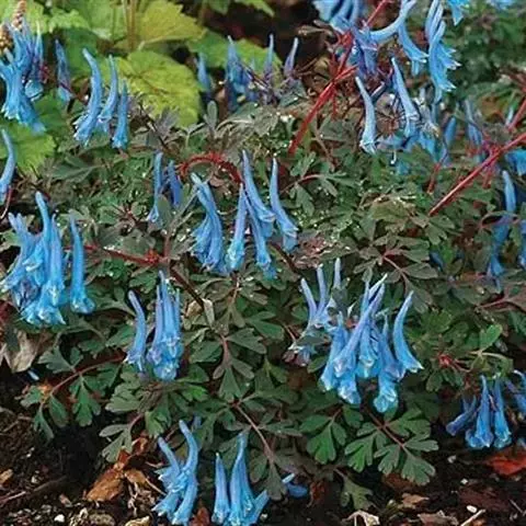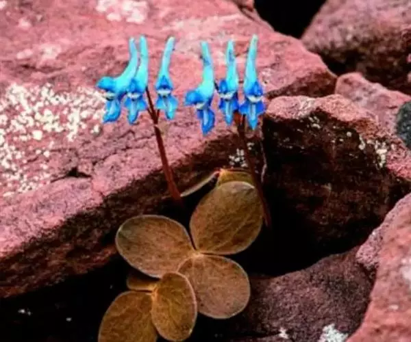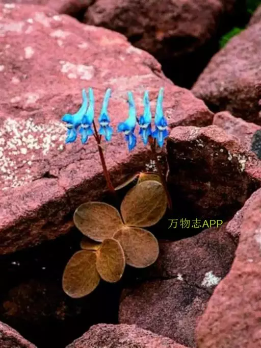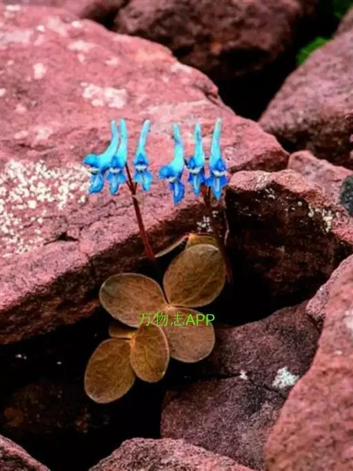块茎长3-5厘米,圆柱形,分枝或不分枝。茎长10-30厘米,地下部分较长,具2-3鳞片,地上部分分枝,具叶。叶三出,具长柄,基部多少具鞘;小叶肉质,较厚,圆形至椭圆形,无柄或近无柄,长1-2.5厘米,宽约与长相等至较狭其2倍,全缘,上面淡蓝色,下面腊黄状苍白色,具3条纵脉。花序伞房状或近伞形,具3-9花及长3-10厘米的花序轴。苞片倒卵圆形,小而钝,长(3-)5-15毫米。花梗粗而直立,长7-30毫米。萼片近圆形,长约1.5毫米,多少具齿。花蓝白色,蓝色至蓝紫色。外花瓣急尖,常具明显或不明显的鸡冠状突起。上花瓣多少弧形上弯,长(1.6)1.8-2.3厘米;距长1.2-1.5厘米,近直或上弯;蜜腺体约占距长的2/3,末端钝。下花瓣稍向前伸出,瓣片多少下弯,基部具浅囊。内花瓣长9-10毫米。柱头扁四方形,前端具4短柱状乳突。蒴果倒卵圆形,长7-12毫米,宽3-4.5毫米,俯垂于直立的花梗上,具5-10种子和2-3毫米长的花柱。