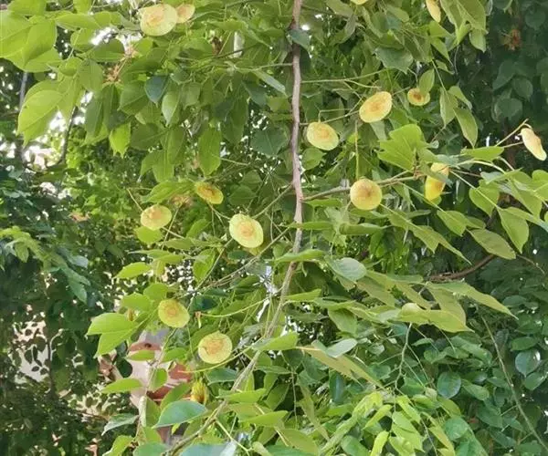 荚果圆形,扁平,偏斜,宽约5厘米,对种子部分略被毛且有网纹,周围具宽翅,翅宽可达2厘米,有种子1-2粒。花期春季。