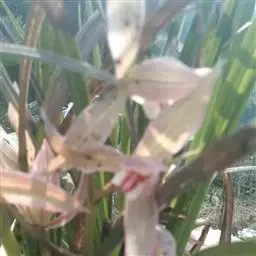 花葶长10-17厘米,紫色,具2枚鞘;鞘膜质,下部抱茎,长3-4厘米;花苞片小,凋落;花梗和子房长7-9毫米;花大,白色而带肉红色或淡紫色晕,唇瓣有紫红色斑点;萼片长圆状披针形,长2.7-3.3厘米,宽7-9毫米,先端钝,有5-7脉;侧萼片稍斜歪。