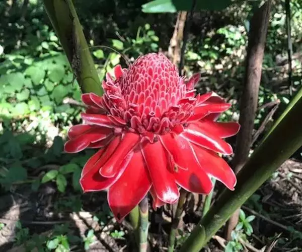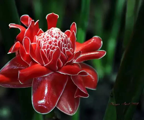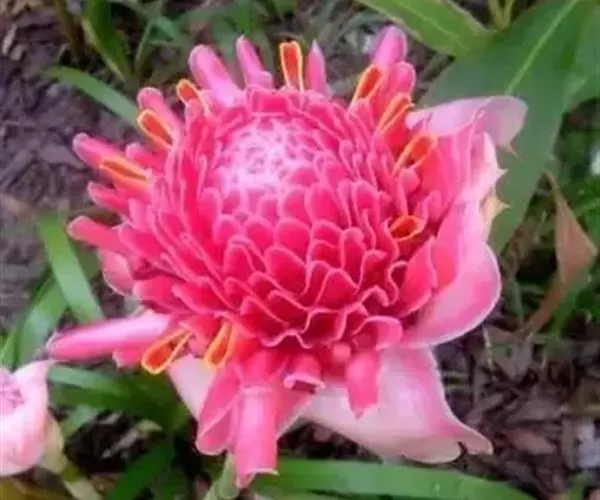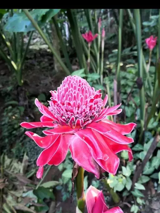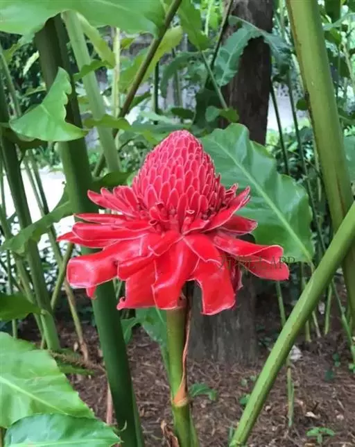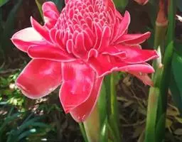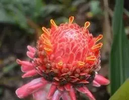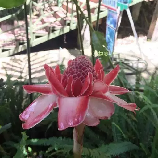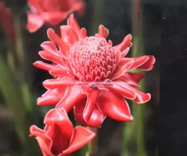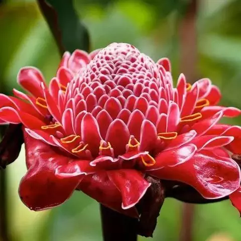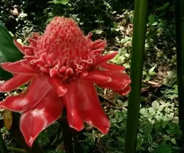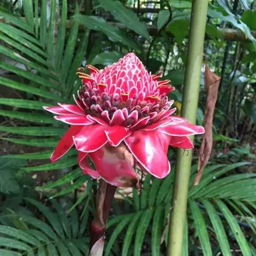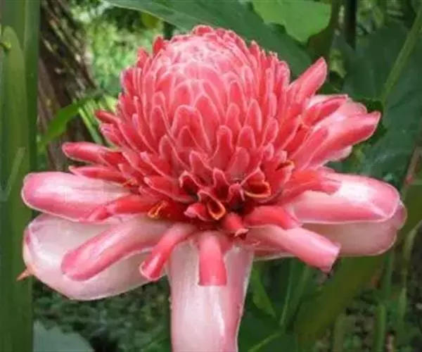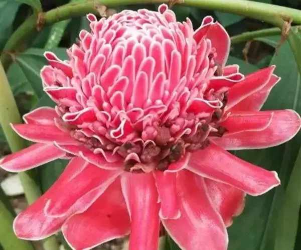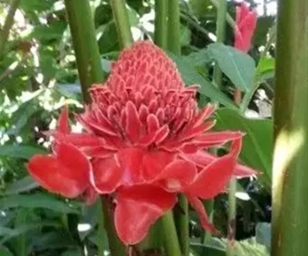 瓷玫瑰(学名:Etlingera elatior)是姜科艳山姜属多年生草本植物,植株丛生,株高3-7米,叶互生,二行排列,长圆状披针形,叶色深绿,光滑,长50厘米左右,宽15厘米左右,头状花序由地下茎抽出,玫瑰花型,花瓣革质,表面光滑,亮丽如瓷,有50-100瓣不等。花期夏季。