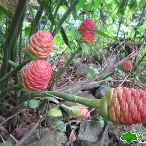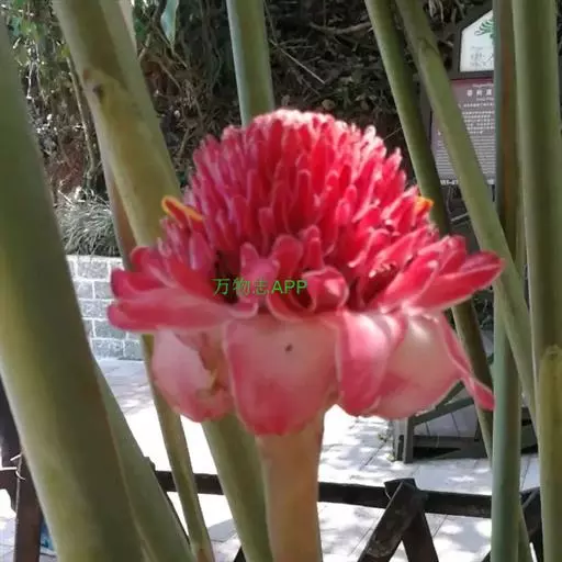 姜科。直立强壮草本, 高达5m。原产马来西亚,云南引种栽培。花期4~6月。本种花序极美丽,苞片发瓷质亮光,故得名。