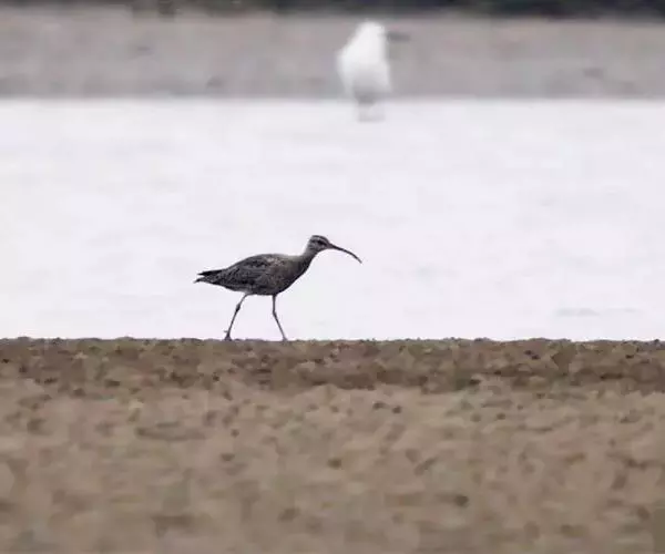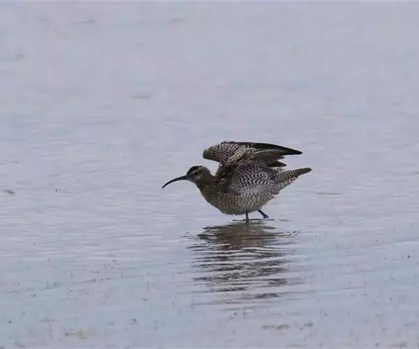 中杓鹬(学名:Numenius phaeopus):体重315-475克,体长384-455毫米。中型涉禽,眉纹色浅,具黑色顶纹,基部淡褐色或肉色,嘴黑色、细长而向下弯曲呈弧状;头、颈淡褐色具黑色纵纹;头顶具乳黄色中央冠纹,头两侧具黑色侧冠纹,眉纹皮黄色。背黑褐色具皮黄色和白色斑纹。下体淡褐色,胸具黑褐色纵纹,两胁具黑褐色横斑。飞翔时可见腰和尾上覆羽白色。虹膜黑褐色、嘴黑褐色,细长而向下弯曲,基部淡褐色或肉色,脚蓝灰色或青灰色。