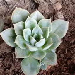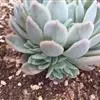 多年生肉质草本植物,植株肉质叶排成紧密的莲座状。匙型叶片,叶缘光滑无褶皱,有细细的长叶尖。叶片明显比较厚,先端急尖容易晒红。叶色常年蓝白,叶面上覆有轻微白粉,老叶白粉自然掉落後呈光滑状。若桃是小型品种,多年群生后,植株会非常壮观,开簇状花穗,花开微黄,先端红,五裂。