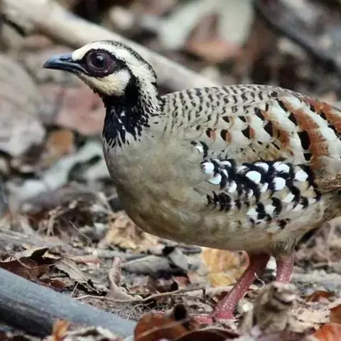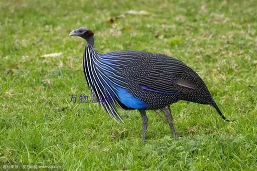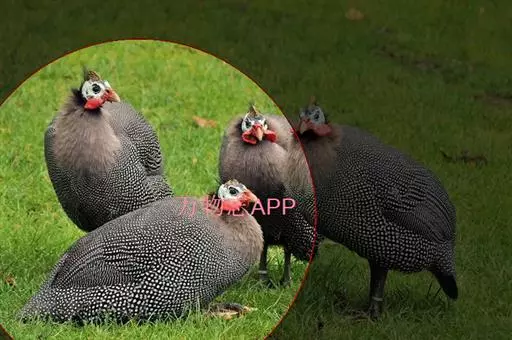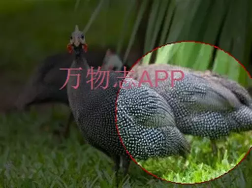 珠鸡又叫珍珠鸡、普通珠鸡。体长72—220厘米,体重1590—2725克。雄鸟头顶和羽冠黑色。裸露的脸部为蓝灰色。体羽主要为暗褐色,有皮黄色和暗褐红色的斑纹。翅膀和尾羽上有白斑和呈灰绿色、紫色和皮黄色虹彩的眼状斑,在内侧飞羽上排成一列,外圈为黑色及淡皮黄色。雌鸟头顶为黑色并有棕褐色和皮黄色羽缘,冠羽为暗灰色。裸露的脸部为蓝灰色。后头为栗褐红色。体羽有黑色杂斑和条纹,以及褐红色、栗色和皮黄色的虫蠹状斑纹。虹膜褐色;嘴浅蓝色或白色;腿、脚近红色。