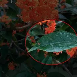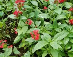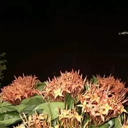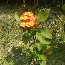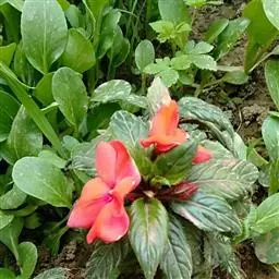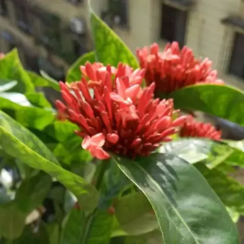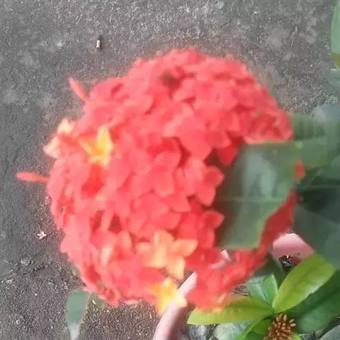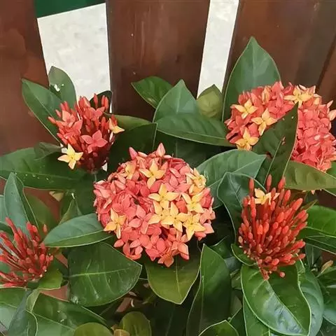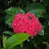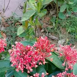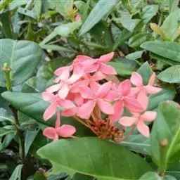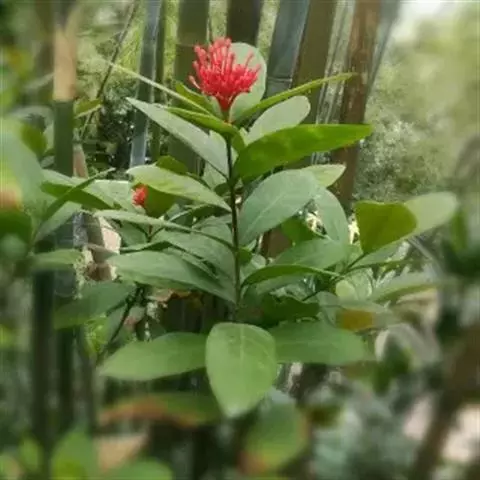 海南龙船花 叶: 叶纸质,长圆形,长5-14厘米,宽2-5厘米,先端钝圆,基部楔形或稍圆,侧脉8-10对,近叶缘连成边脉;叶柄长3-6毫米,托叶卵形,长0.4-1厘米,先端长渐尖,渐尖部分长3-4毫米。