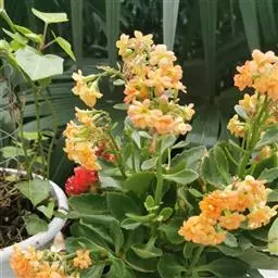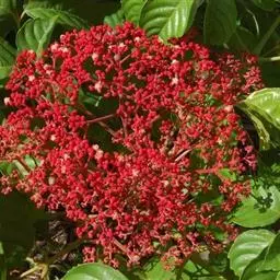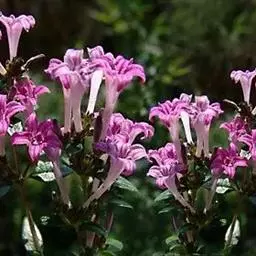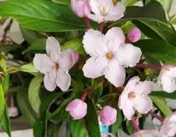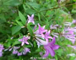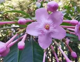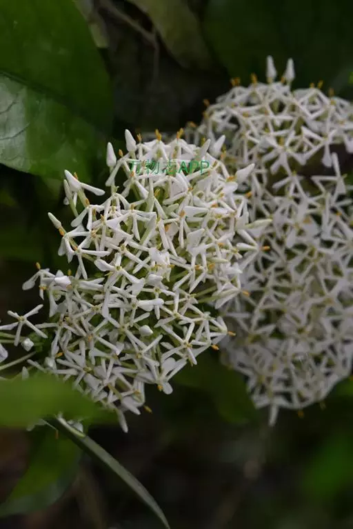 花: 3歧伞房聚伞花序长达7厘米,花序梗长约4厘米。花芳香,花梗长1-2毫米;有苞片和小苞片;萼筒长约1.5毫米,花萼裂片与萼筒等长或略短;花冠白色,冠筒长2.5-3.5厘米,花冠裂片长圆形,长6-7毫米,花药伸出。