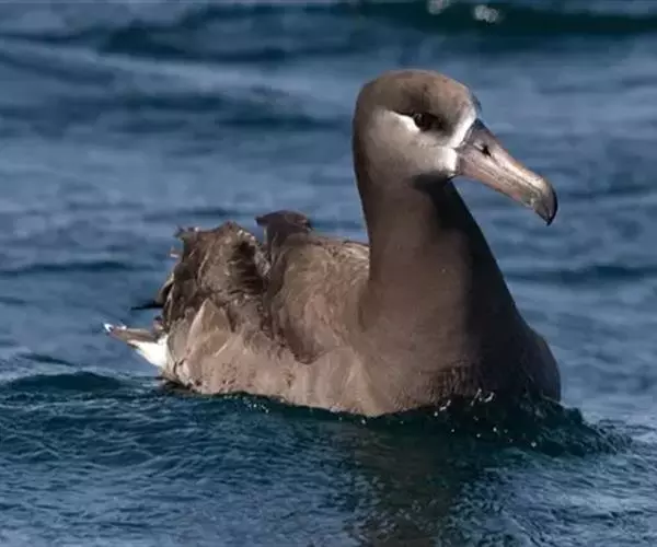 黑脚信天翁上体黑褐色,部分尾上覆羽白色,下体灰色,往腹中部逐渐变淡。尾下覆羽亦有部分为白色。嘴基周围白色,前额灰色,眼下和经过眼区有白色横斑。颊前部和颏白色,颊后部、喉和耳区灰色,前颈灰褐色。飞羽、翅覆羽和尾羽黑褐色,略较上体为暗。体羽厚而密,紧覆于身上。翅尖长。初级飞羽11枚,第一枚退化,第二枚最长,第十一枚最短。次级飞羽37枚,非常短。肩羽非常长,尾短而稍圆,尾羽12枚。嘴强而侧扁、长度中等,几和头等长。脚强而短,跗蹠左右侧扁,具网状鳞,后趾匿藏于皮下。