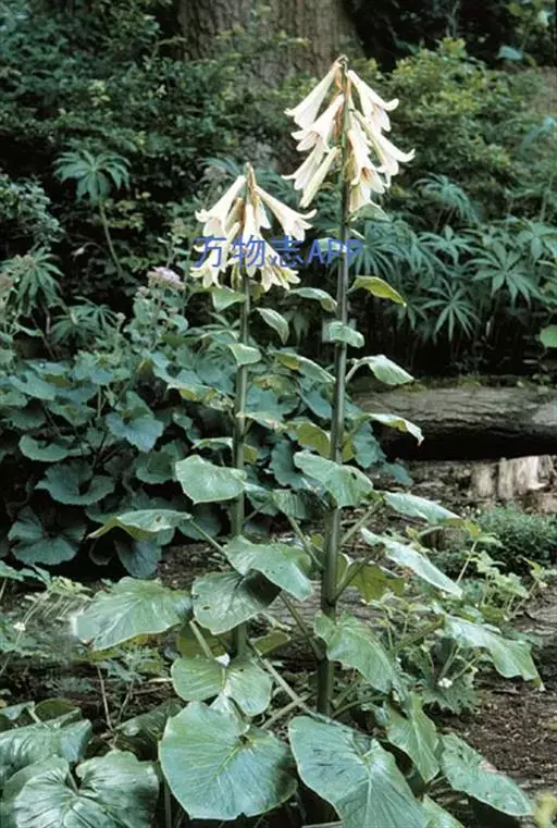 云南大百合Cardiocridum giganteum株高1~2米;地下部基生叶的叶柄基部膨大形成鳞茎,开花后凋萎;在老鳞茎基部每年可形成数个小鳞茎。花茎高大,直径达3~4厘米,中空,无毛。云南大百合产于云南西部、西藏东南部、四川、贵州、陕西、广西和湖南等省区;生长于海拔1450~2800米的阴湿山谷、沟旁林中。云南大百合大而洁白, 艳而不俗 , 十 分高雅 , 配 以 秀丽 嫩绿的大叶, 是庭院 中十分珍贵的观赏植物。