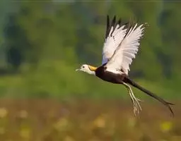 凤头麦鸡(学名:Vanellus vanellus):中型涉禽,体长29-34厘米。头顶具细长而稍向前弯的黑色冠羽,像突出于头顶的角,甚为醒目。鼻孔线形,位于鼻沟里。鼻沟的长度超过嘴长的一半。翅形圆。跗蹠修长,胫下部亦裸出。中趾最长,趾间具蹼或不具蹼,后趾形小或退化。翅形尖长,第1枚初级飞羽退化,形狭窄,甚短小;第2枚初级飞羽较第3枚长或者等长。三级飞羽特长。尾形短圆,尾羽12枚。