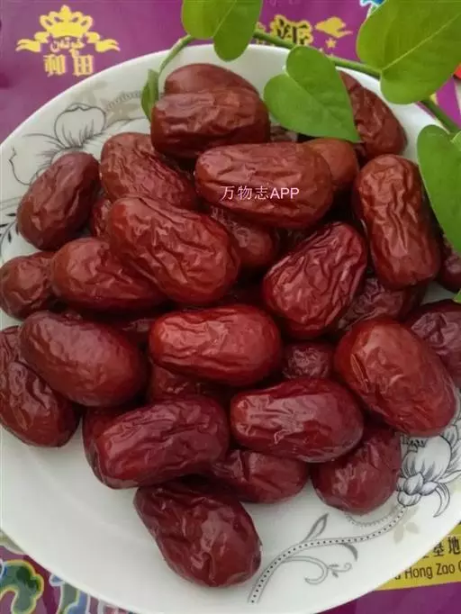 新疆和田地区的和田红枣。和田红枣的营养和保健价值极高。它含蛋白质、脂肪、糖类、纤维素;红枣营养十分丰富。维生素C含量在水果中名列前 茅,每百克含量达0.1~0.6克,比苹果、桃子等高100倍左右,维生素P的含量也是百果之冠,人们称赞枣是“天然的维生素丸”。人们历来就把红枣视为极佳的滋补品。红枣不但是美味果品,还是滋补良药,有强筋壮骨、补血行气、滋颐润颜之功效。