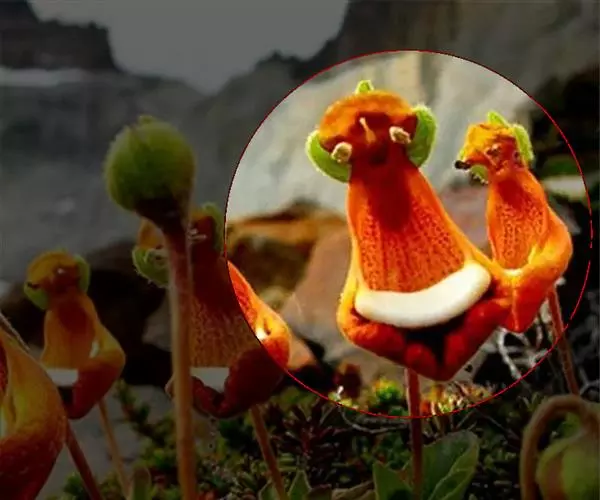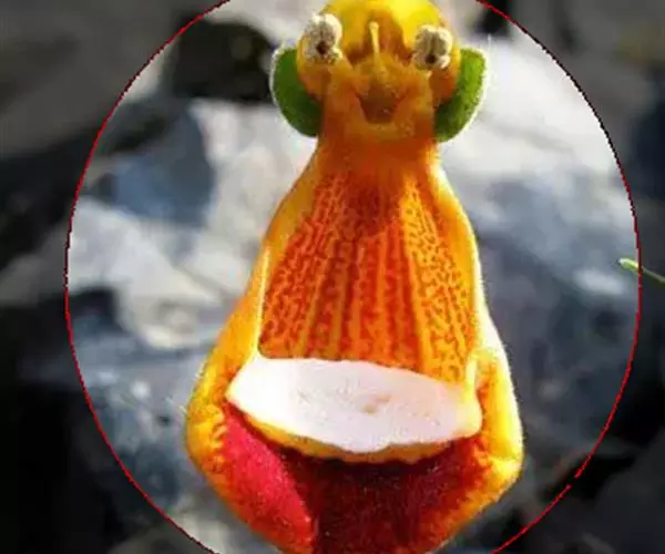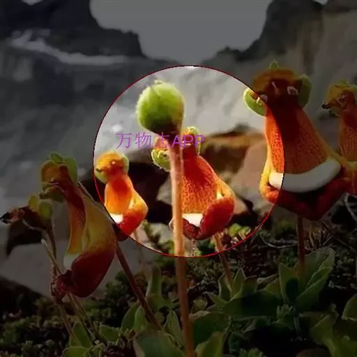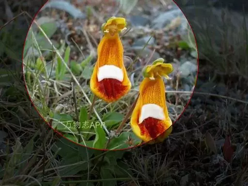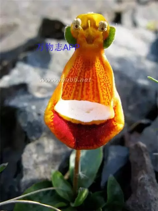 叶片卵形对生。花形别致,花冠二唇状,上唇瓣直立较小,下唇瓣膨大似蒲包状,中间形成空室,柱头着生在两个囊状物之间。