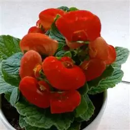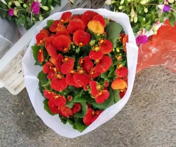 荷包花 蒲包花正值春节应市,奇特的花形,惹人喜爱。也是很好的礼仪花卉,送上一盆鲜红的蒲包花,使节日的气氛更为浓厚。若摆放窗台、阳台或客室,红花翠叶,顿时满室生辉,热闹非凡。在商厦橱窗、宾馆茶室、机场贵宾室点缀数盆蒲包花,绚丽夺目,蔚为奇趣。