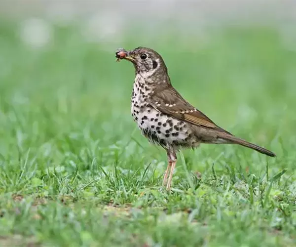 宝兴歌鸫为中型鸟类,体长20-24cm。上体橄榄褐色,眉纹棕白色,耳羽淡皮黄色具黑色端斑,在耳区形成显著的黑色块斑。下体白色,密布圆形黑色斑点。