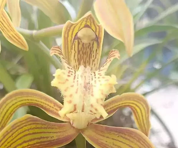 虎头兰是附生草本植物;假鳞茎狭椭圆形至狭卵形,长3-8厘米,宽1.5-3厘米,大部分包藏于叶基之内。叶4-6 (-8)枚,长35-60(-80)厘米,宽1.4-2. 3厘米,带形,先端急尖,关节位于距基部(4-)6-10厘米处。