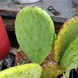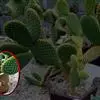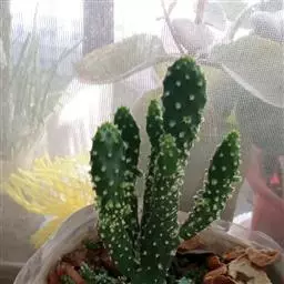 仙人掌科植物,呈灌木状丛生。为黄毛掌的变种。植株比黄毛掌矮小,刺座较稀,钩毛白色,花蕾红色,开后为黄白色。 株高0.5~2米。茎直立,基部稍木质化,呈圆柱形,其余呈掌状,扁平,每一节间倒卵形至椭圆形,绿色。花单生于刺窝上,鲜黄色。浆果梨形,无刺,紫红色 。