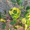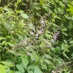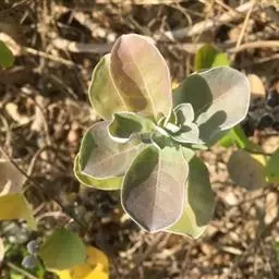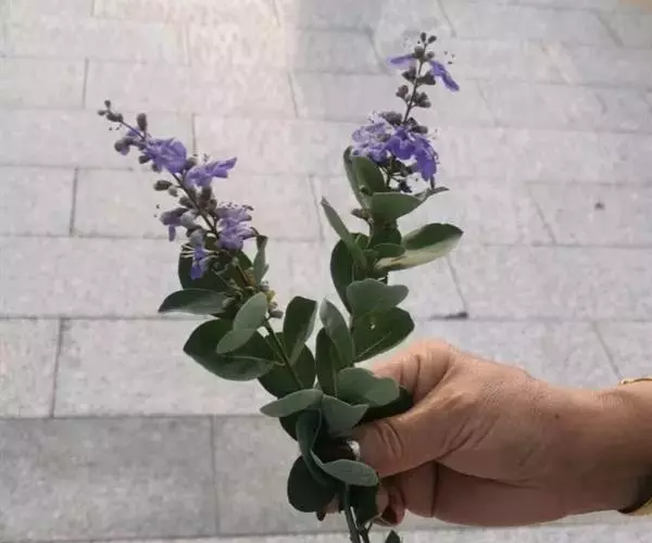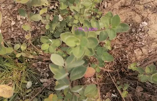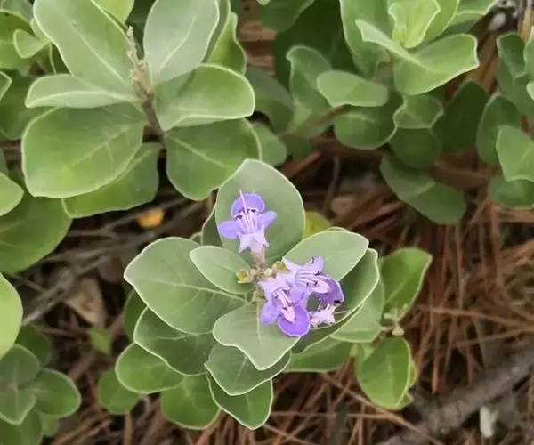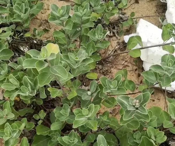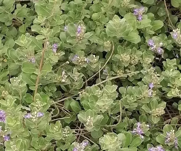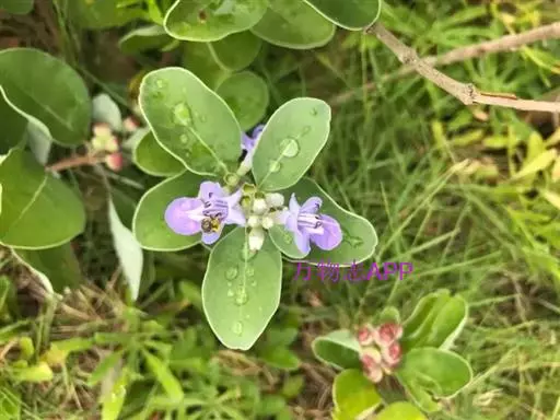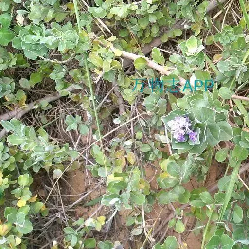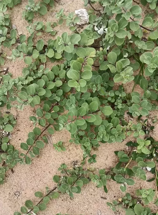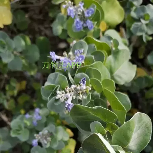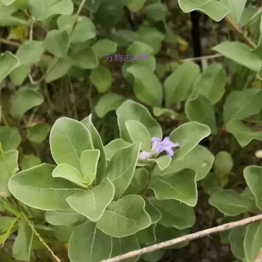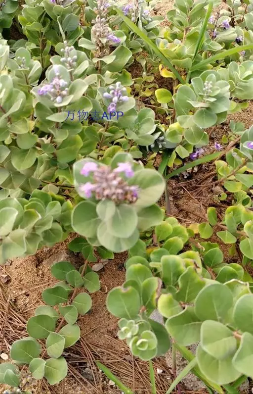 单叶蔓荆 落叶灌木,罕为小乔木,高1.5-5米,有香味;小枝四棱形,密生细柔毛。茎匍匐,节处常生不定根。单叶对生,叶片倒卵形或近圆形,顶端通常钝圆或有短尖头,基部楔形,全缘,长2.5-5厘米,宽1.5-3厘米。表面绿色,无毛或被微柔毛,背面密被灰白色绒毛,侧脉约8对,两面稍隆起,小叶无柄或有时中间小叶基部下延成短柄。