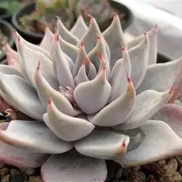 福娘为景天科银波锦属的肉质草本植物。对生的叶片呈短棒状,叶色灰绿,表覆白粉,叶缘外围镶着紫红色,…