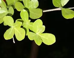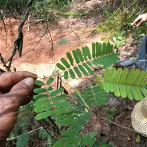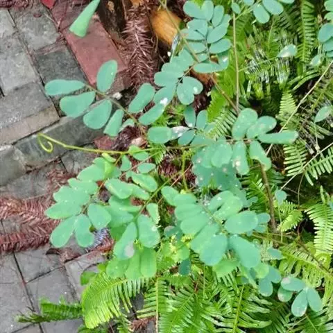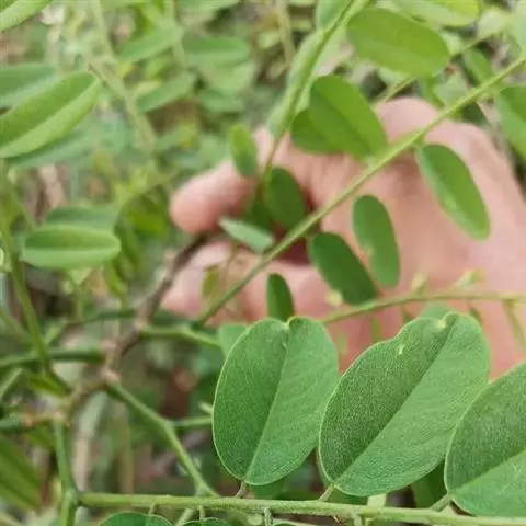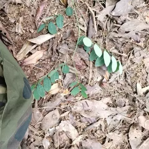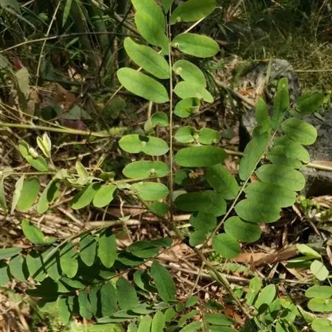 藤本,有时为灌木。枝长,干时黑色。羽状复叶长12-17厘米;叶轴、叶柄均略被犬贴微柔毛;小叶2-3对,近革质,卵形或椭圆形,长3.5-6厘米,宽1.5-3厘米,先端钝,微缺,基部楔形,上面无毛,下面干时粉白色,略被伏贴微柔毛。