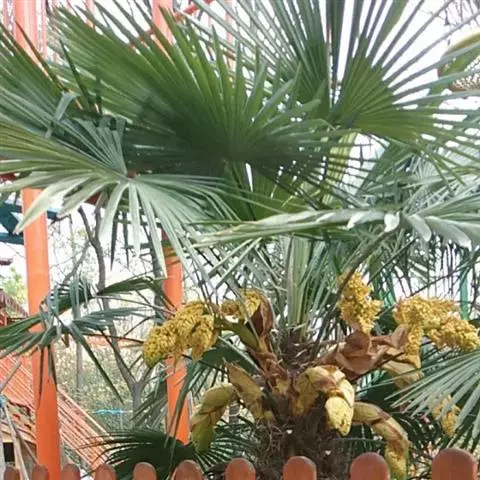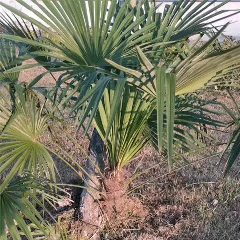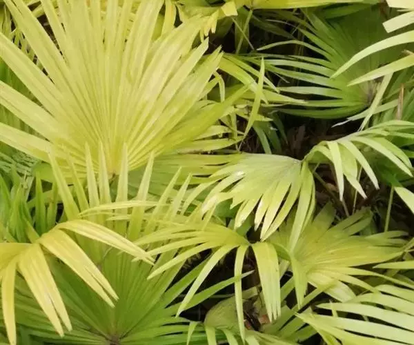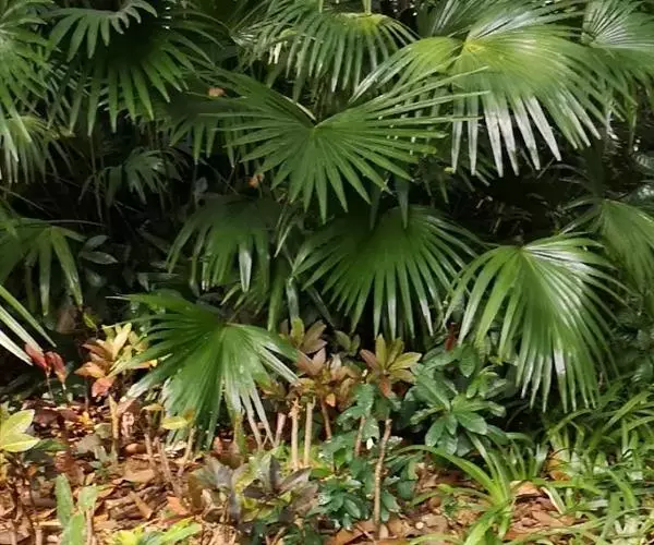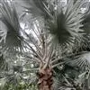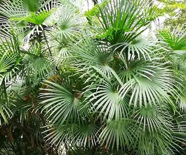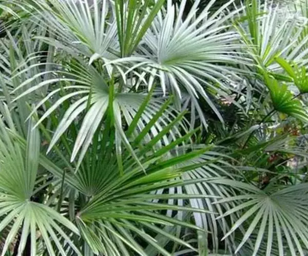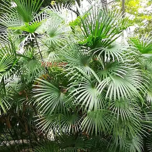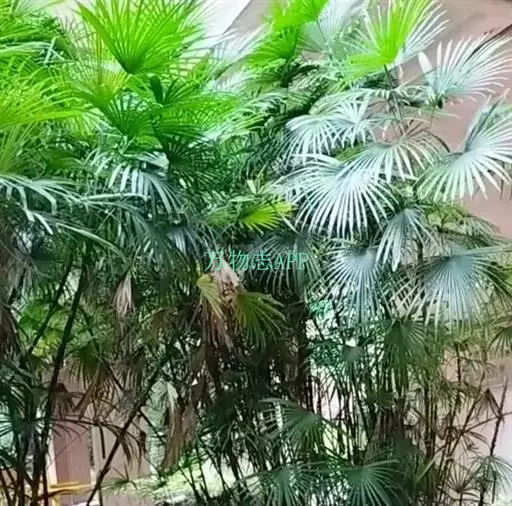 常绿丛生灌木至小乔木状,高3-8m,茎直立、粗壮。叶团扇形,宽50-80厘米,掌状深裂,裂片14-16,线形,先端渐尖,不分裂,或者为2浅裂;叶柄上面具沟槽,无剌。肉穗花序腋生,多分枝,呈圆锥花序式,主轴和分枝上有的管状总苞和漏斗状的小苞片;花两性,子房由2枚合生心皮组成,长圆形,花柱短,柱头2枚。浆果球形,直径约1.5厘米,成熟时呈黄色至红色,外果皮薄革质,中果皮内质;种子球形,径约1厘米,灰白色,具有观赏价值。